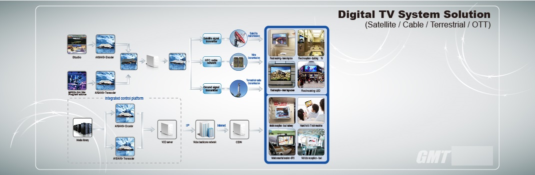 The scheme is a whole solution based on satellite, cable, terrestrial wireless , OTT and other means of transmission of digital TV and network television system, full coverage of digital TV broadcasting and value-added services, according to the service project and the bandwidth available to provide customers cost-effective and efficient scheme. Scheme of hardware and software meet the advanced AVS/AVS+/H.264 /H.265 / AVS2 international and domestic standards, service specification, efficient management, open system interface, layered and modular design to ensure safe and stable operation of the system , saving system management and maintenance overhead Effectively.