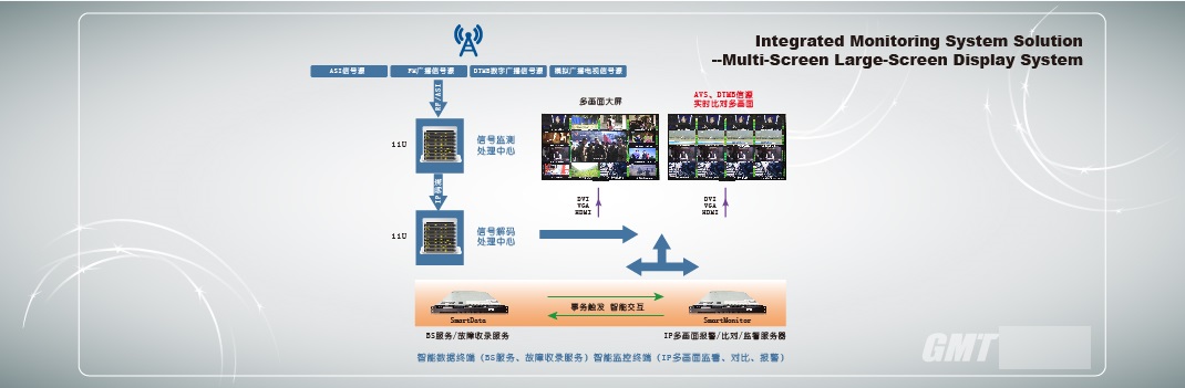 The system is a full-digital and fully IP monitoring system, monitoring DTMB, analog open-circuit television, FM radio, AM radio, CMMB and all open radio signals, monitoring the status of transmitter and remote automatic control, and monitoring the dynamic environment of the engine room and other indicators. The monitoring site is connected to the central computer room at the upper level through the broadcast network, the Internet or 4G/3G network, and forms a network monitoring system with a center and a front end.