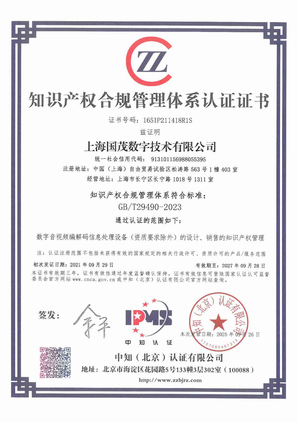 上海國(guó)茂數(shù)字技術(shù)有限公司通過(guò)GB/T29490-2023知識(shí)產(chǎn)權(quán)管理體系認(rèn)證.