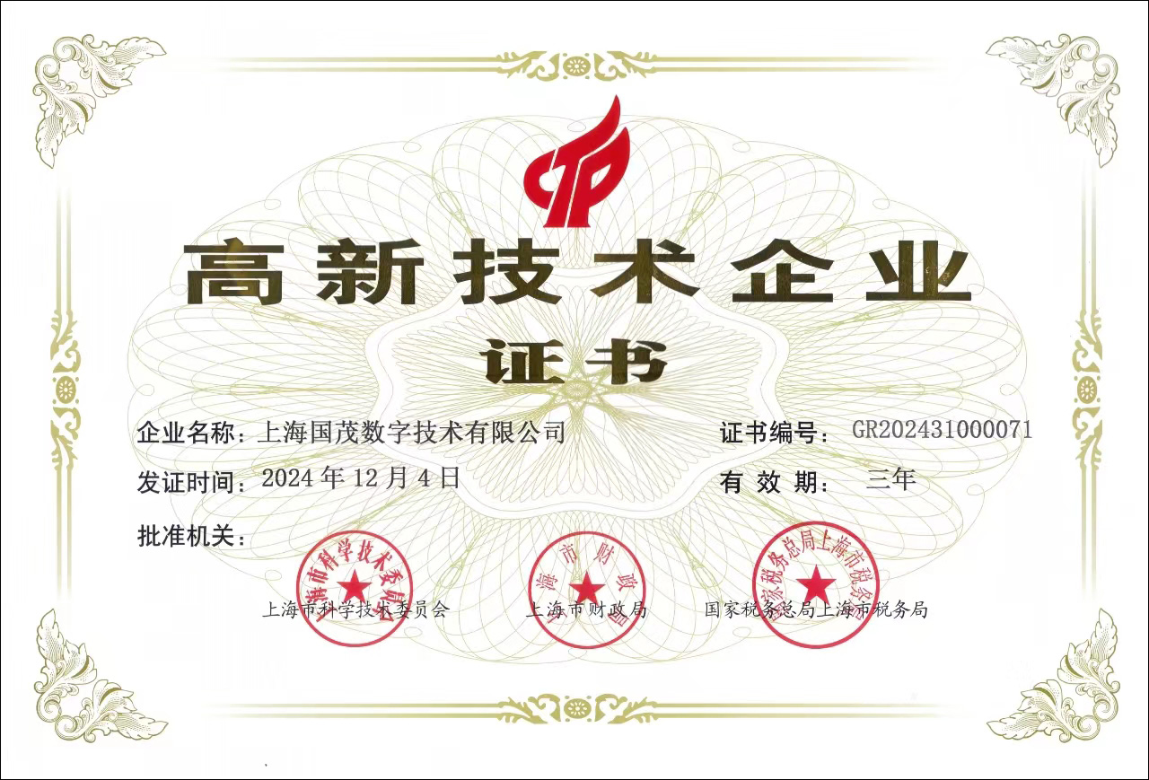 上海國(guó)茂數(shù)字技術(shù)有限公司第五次通過(guò)國(guó)家高新技術(shù)企業(yè)認(rèn)定(證書(shū)編號(hào):GR202431000071)。