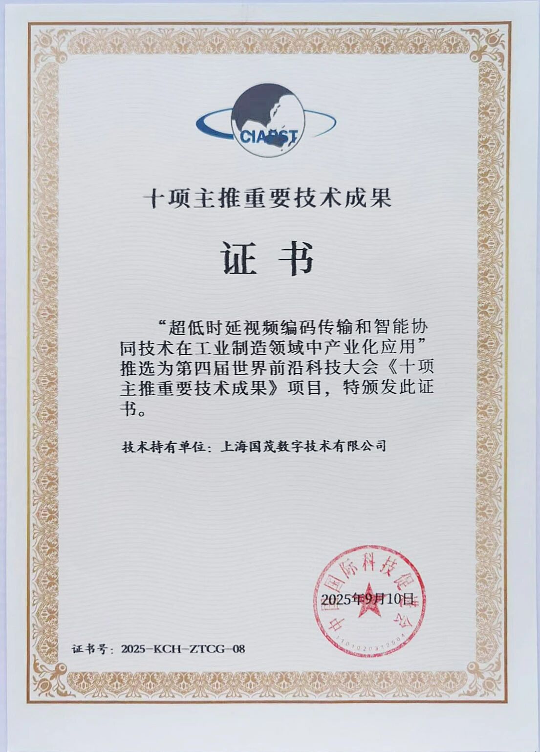 海國(guó)茂數(shù)字技術(shù)有限公司“超低時(shí)延視頻編碼傳輸和智能協(xié)同技術(shù)”亮相第四屆世界前沿科技大會(huì)并獲重點(diǎn)推薦成果。