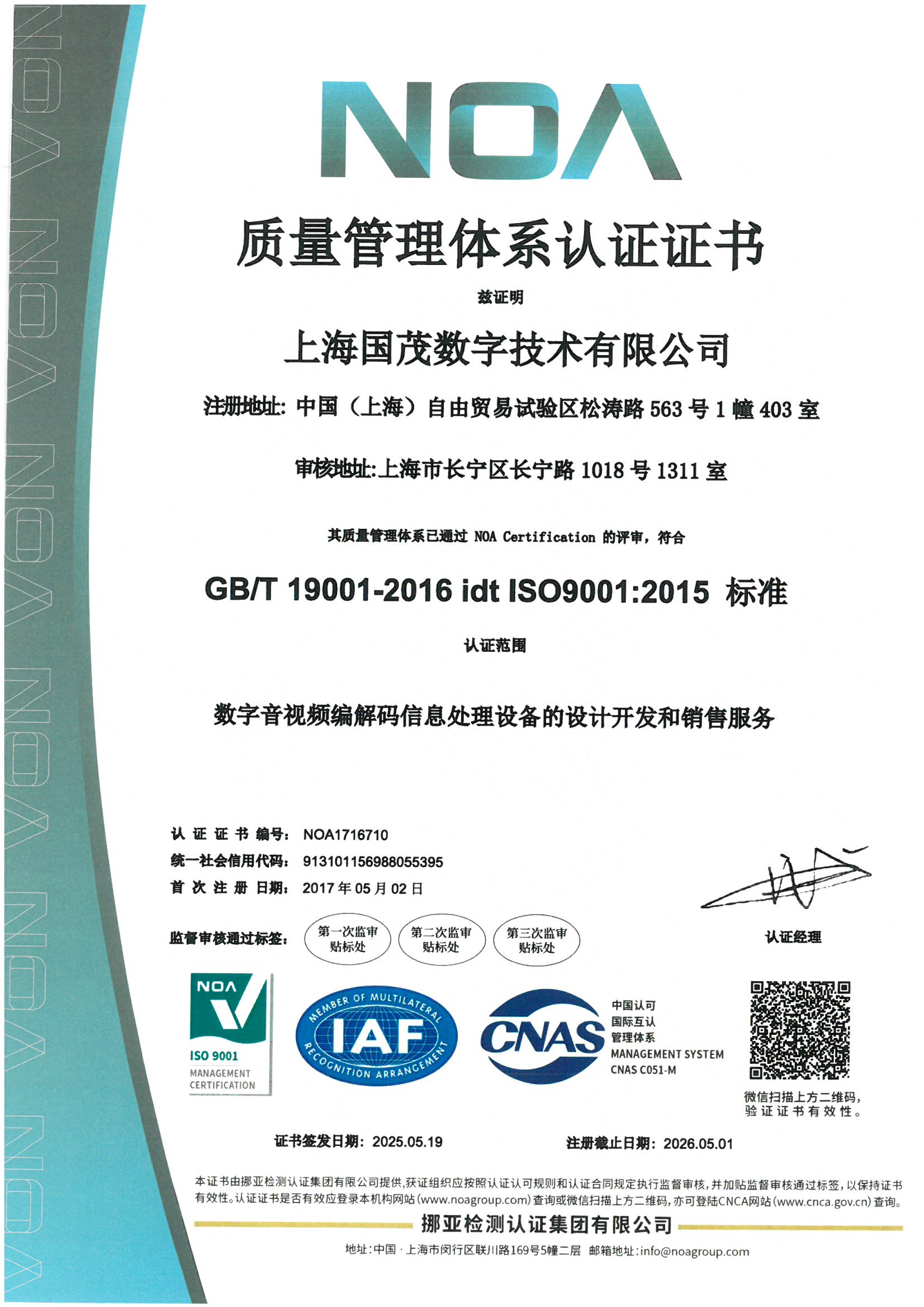 上海國(guó)茂數(shù)字技術(shù)有限公司連續(xù)14年通過(guò)ISO:9001審核.