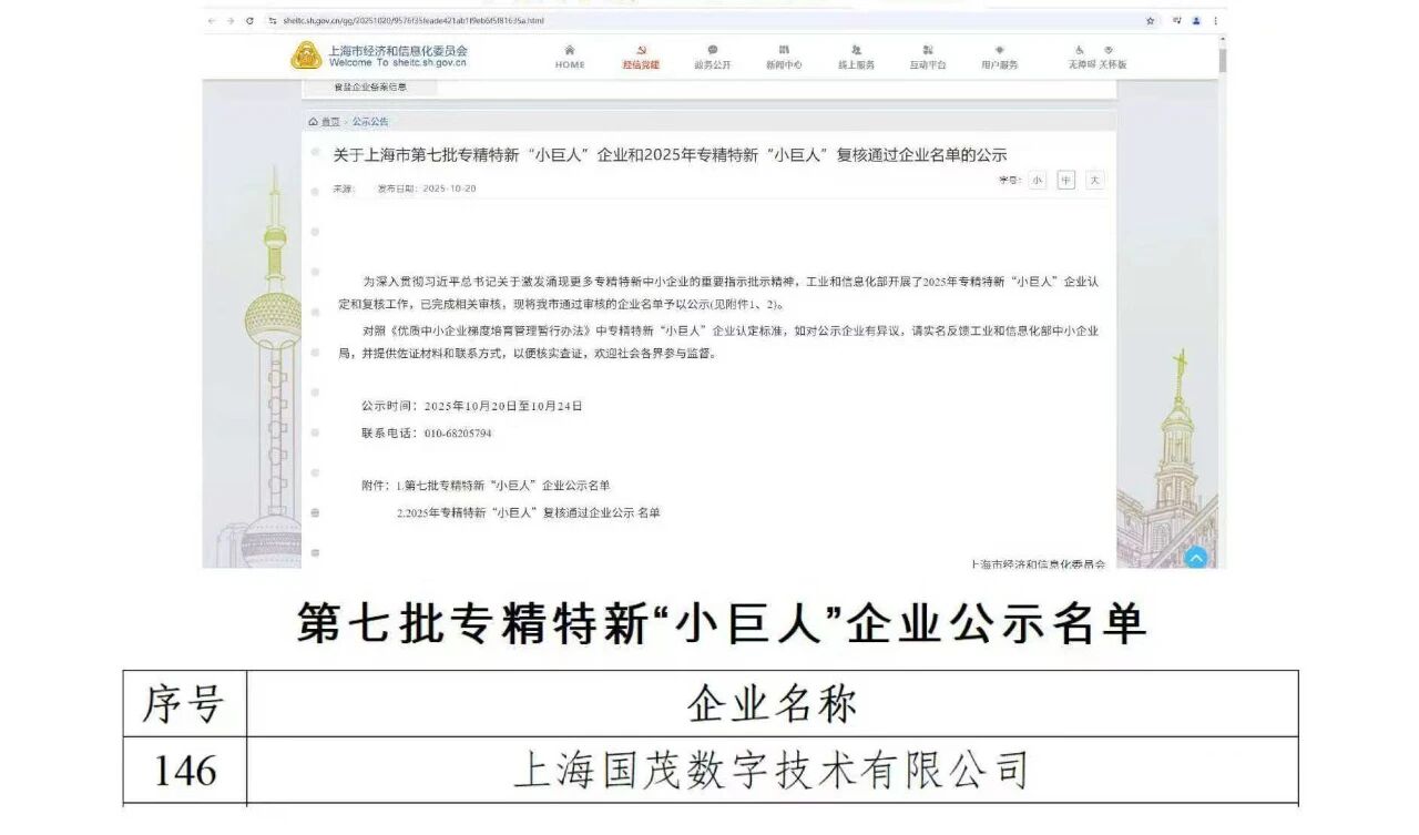 上海國(guó)茂數(shù)字技術(shù)有限公司憑借在數(shù)字音視頻領(lǐng)域突出的技術(shù)創(chuàng)新能力、知識(shí)產(chǎn)權(quán)擁有量、標(biāo)準(zhǔn)制定參與度以及廣泛的應(yīng)用落地成效,成功獲評(píng)國(guó)家級(jí)專精特新“小巨人”企業(yè)。