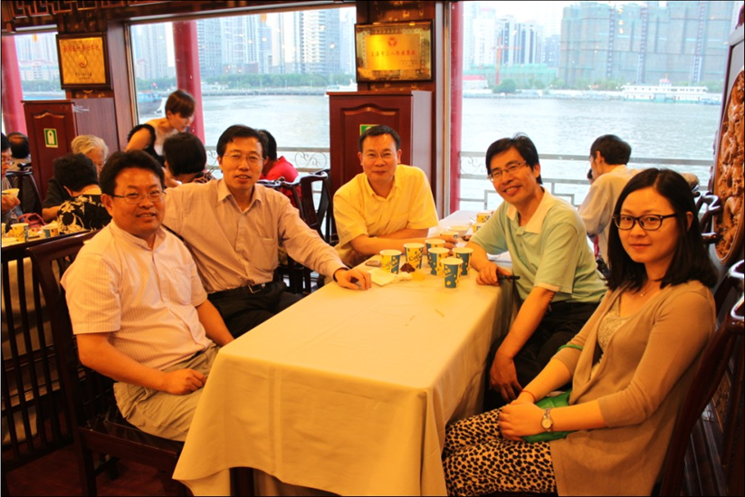 接著,大家前往復(fù)興路碼頭搭乘浦江游覽船。上海的“浦江游覽”具有優(yōu)越的游江條件與濃厚的沿江歷史文化積淀。一水之隔的兩岸盡管風(fēng)格迥異卻一樣令人迷醉,歷史與現(xiàn)實(shí)在江水的分隔下交錯(cuò)演繹。一邊是外灘巍峨屹立的萬(wàn)國(guó)建筑群、外白渡橋和上海最早的公園―黃浦公園,另一邊則是開發(fā)中的浦東新區(qū)、陸家嘴金融貿(mào)易區(qū)現(xiàn)代建筑群。放眼望去,來自各地的船只點(diǎn)綴著江面,沿江行去,入??谟删G色海水、黃色長(zhǎng)江水和青灰色黃浦江水構(gòu)成的“三夾水”,涇渭分明,互不融合,陽(yáng)光下則更為明顯,實(shí)謂奇觀。醉入夜色中,浦江漸漸隱去其驕陽(yáng)下的喧鬧、忙碌,茫茫夜色中、習(xí)習(xí)夜風(fēng)中閃爍霓虹,無(wú)論初識(shí)、熟識(shí)此景的人們都免不了感慨萬(wàn)千。