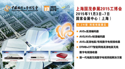 第17屆中國(guó)國(guó)際工業(yè)博覽會(huì)于2015年11月3--7日在上海國(guó)家會(huì)展中心舉行。上海國(guó)茂數(shù)字技術(shù)有限公司在科技創(chuàng)新展區(qū)展示并介紹AVS標(biāo)準(zhǔn)產(chǎn)業(yè)化應(yīng)用成果。 自2002年國(guó)家工信部啟動(dòng)中
